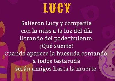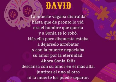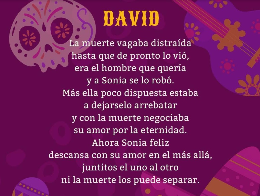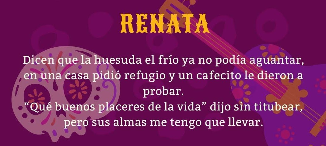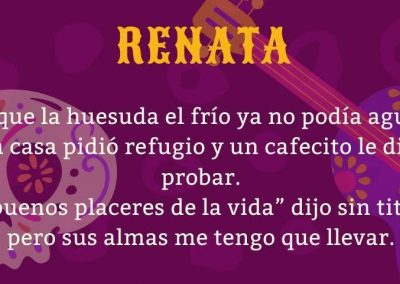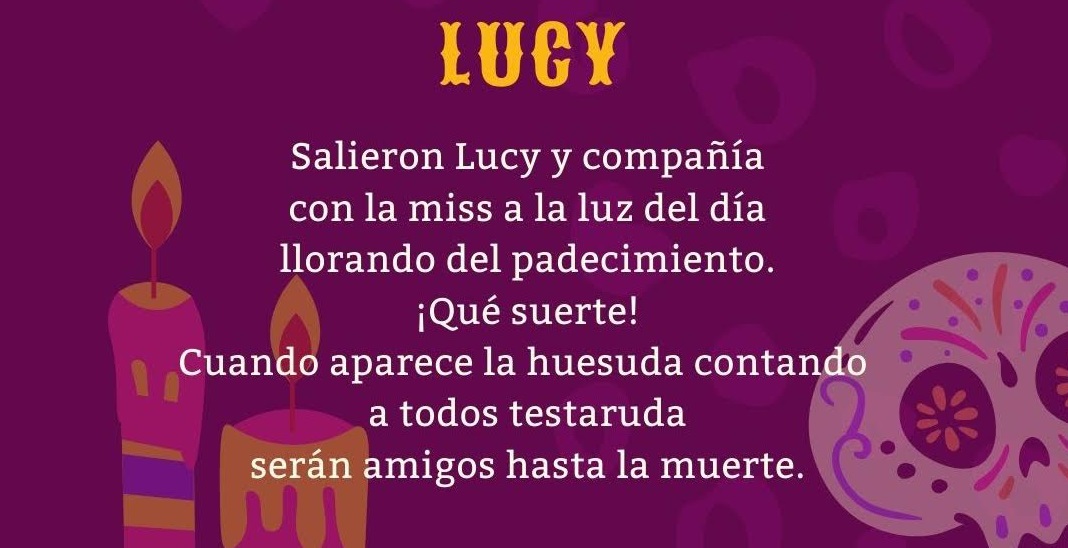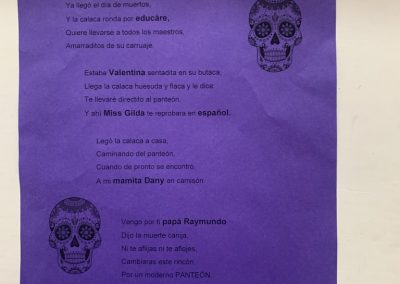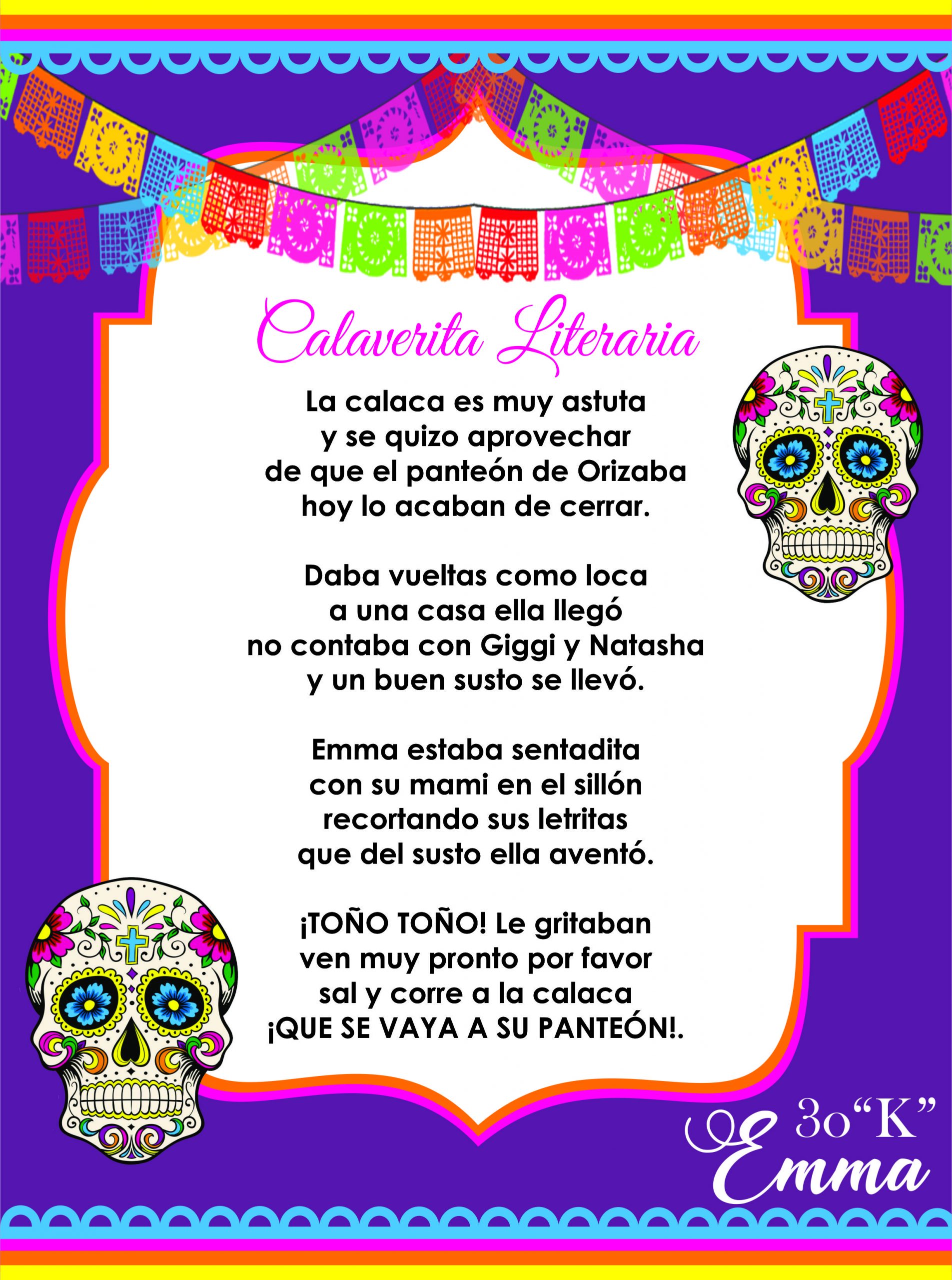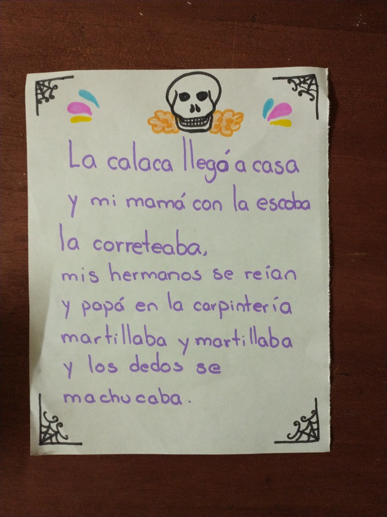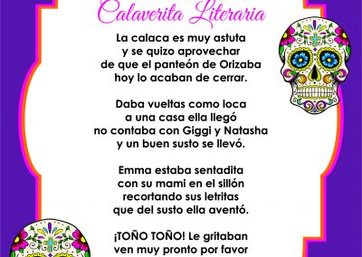 Un elemento indispensable en todo festejo de día de muertos son las calaveritas: composiciones literarias donde se escribe de las personas como si estuvieran muertas a través de versos irreverentes a manera de epitafios. Generalmente tienen un tono burlón y se retrata a los protagonistas burlándose de la muerte a pesar de haber sido llevados por la famosa Flaca o Huesuda.